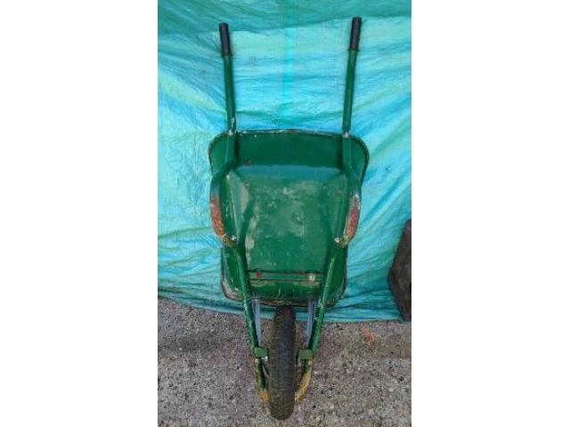 Heavy duty wheelbarrow with pneumatic wheel and inner tube. Suitable for transporting a variety of building objects and refuse.