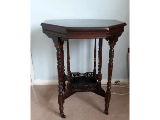 This table needs a bit of TLC . It has barley twist legs with original castors and a low shelf with fret work around the sides. It stands 72 cms tall and 58 cms across the top