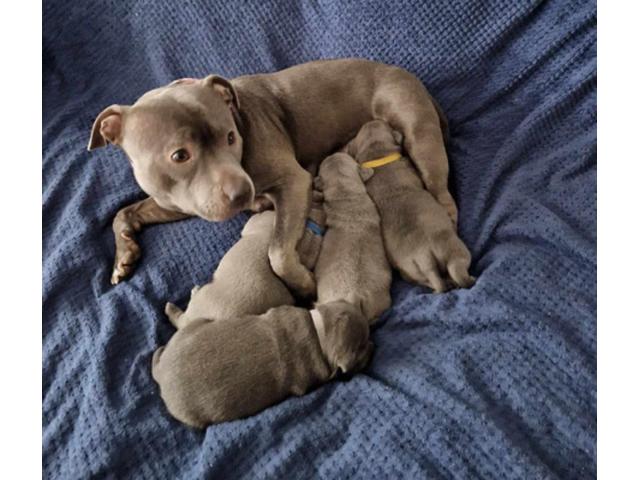 These puppies are being raised in a loving, family environment with lots of attention and socialization. They’re already showing playful and affectionate personalities — typical of the loyal and loving Staffy breed.